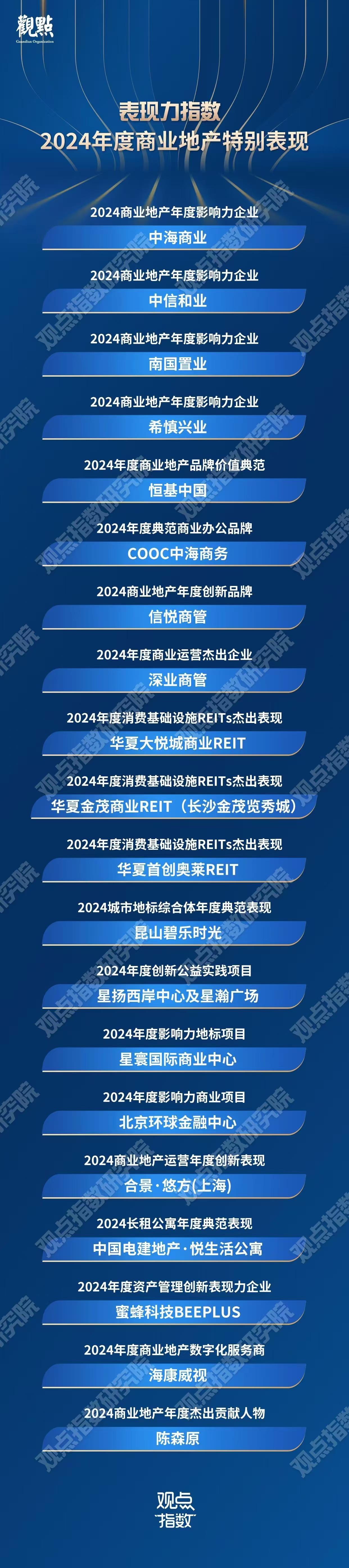 此次发布的《表现力指数•2024年度商业地产特别表现榜单》中,华夏首创奥莱REIT,凭借在消费基础设施REITs领域的贡献获得殊荣。《表现力指数•2024年度商业地产表现报告》由观点指数研究院推出,聚焦众多国内外杰出的商业发展商、金融投资机构、服务运营商、零售品牌以及科技创新领域的行业,旨为解析行业发展变化,为行业发展提供优秀的样本力量。
